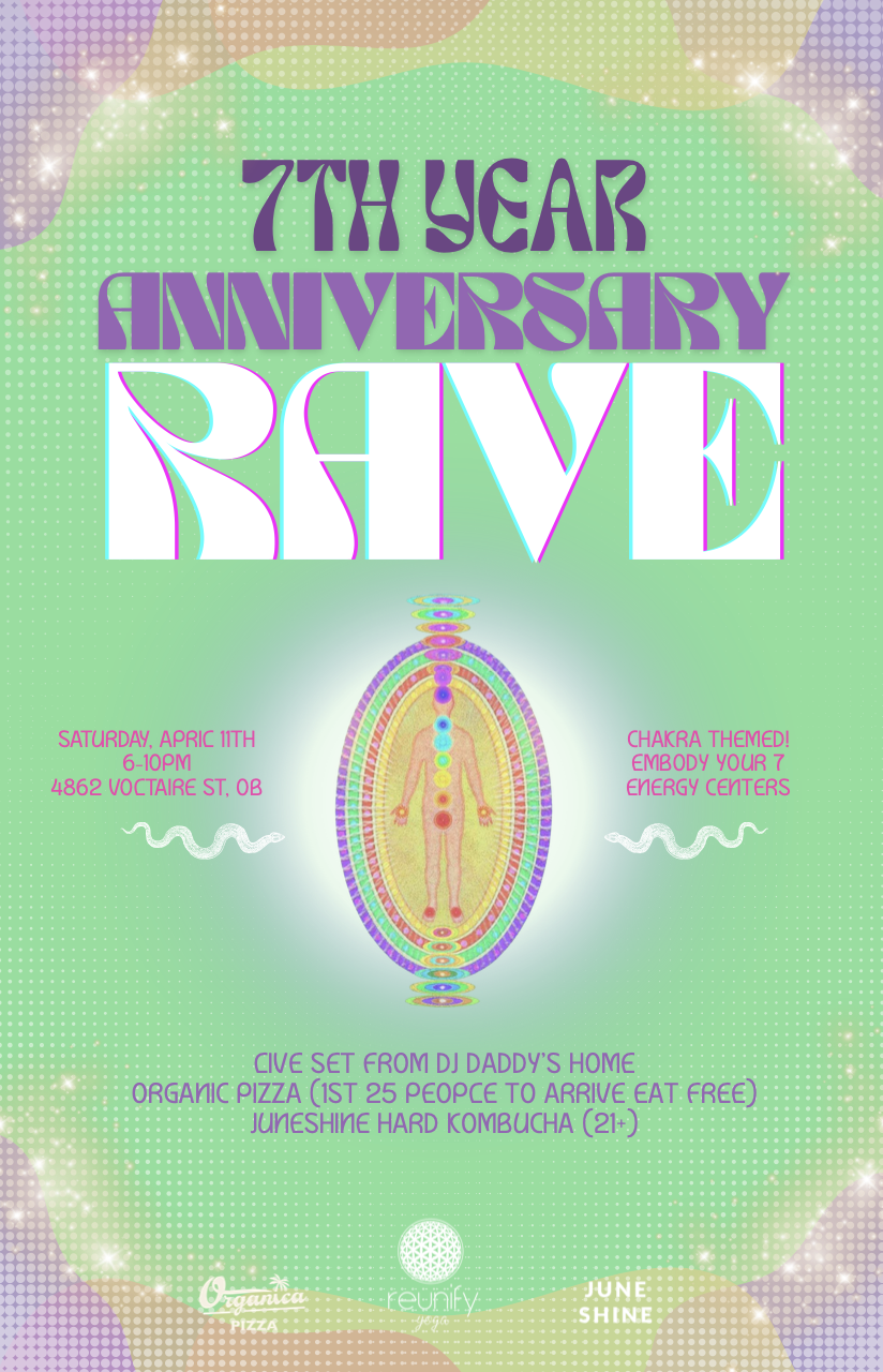 Join us for Reunify Yoga’s 7-Year Anniversary Rave at our outdoor space! Celebrate seven incredible years of community, movement, and growth with live music, delicious food, and high vibes. Come dance, connect, and honor this milestone with us—let’s make it a night to remember!